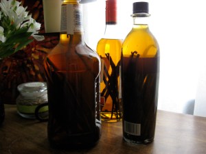 Making vanilla is pretty easy. The big bottle is cheap vodka ($15 maybe?), 80 proof, I cut the tops & bottoms off 12 whole beans and cut them completely in half and put them in the bottle; you might have to pour some off so it doesn’t over flow. Shake the bejesus out of it and put it on in your kitchen window sill. Shake it up every couple days. In 2 weeks its usable, not as pungent as what you may be used too but it will smell incredible, and at 4 weeks it will be done. At this point you can strain it through a fine sieve and, if you dont go through vanilla like I do, transfer it into brown bottles and store (for a little extra punch cut a fresh bean in half and trim to fit in your final storage bottle). I leave the extract in the liquor bottles with the beans in it, exactly as they are pictured, and put them in a dark cupboard. Both ways work, I am just not all Martha Stewart and dont care that my vanilla is in hooch bottles. I also dont care much about the straining to get the flecks out…I prefer to see them.
