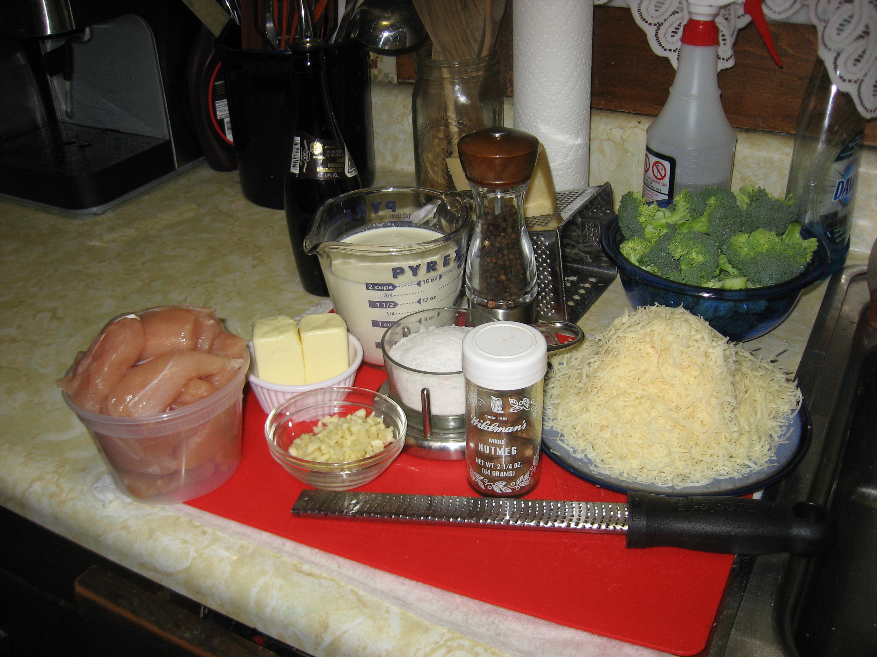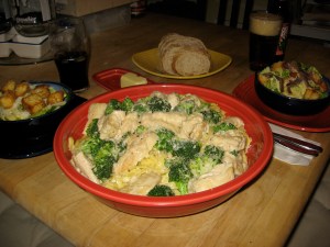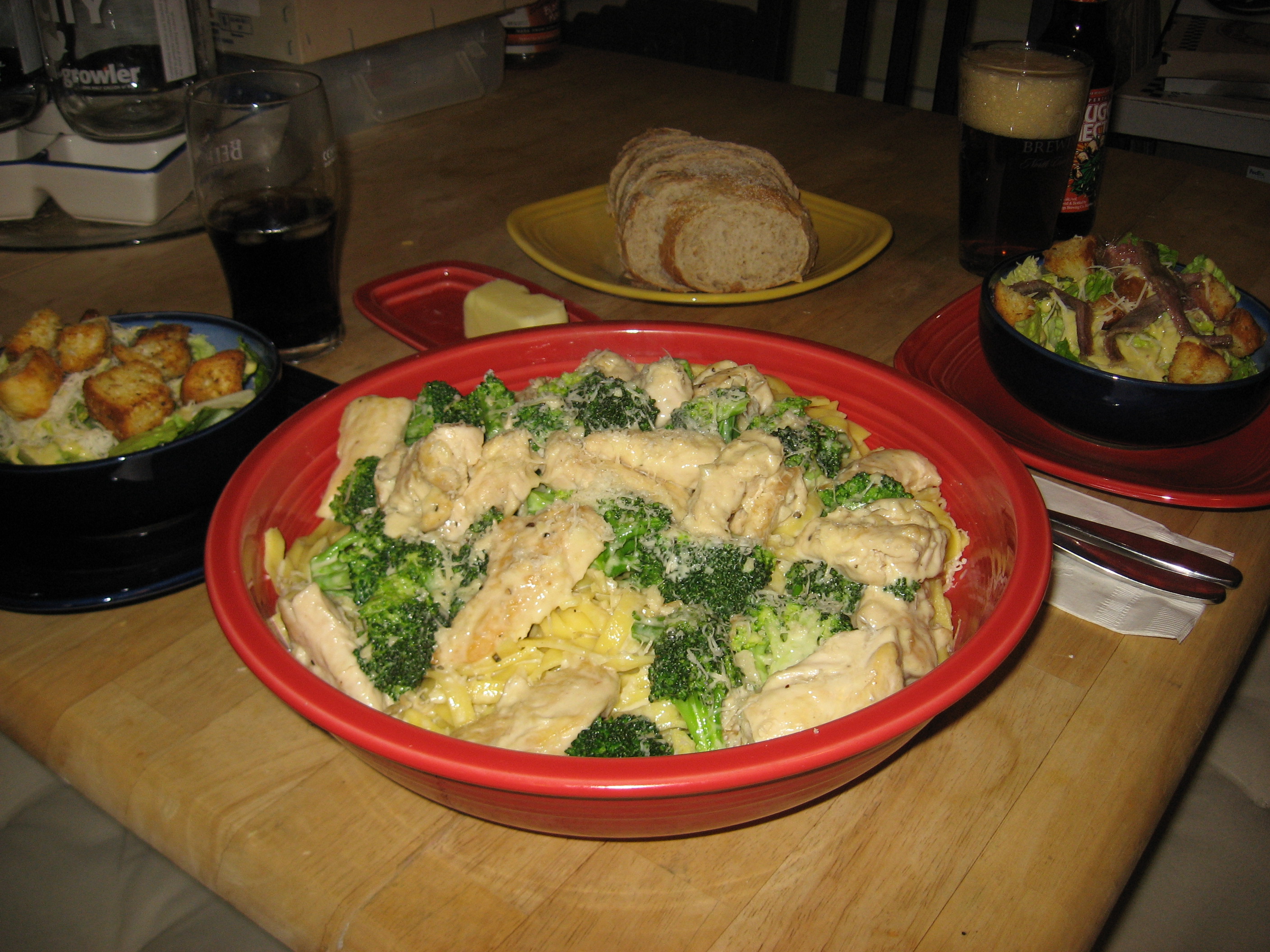 Since this is another full meal post I wrote it with some real time instructions factored in so you get all the stuff to the table at once as conveniently as possible. The night’s menu: Homemade Fettucini with Chicken Broccoli Alfredo, Caesar Salad, Crusty Bread.