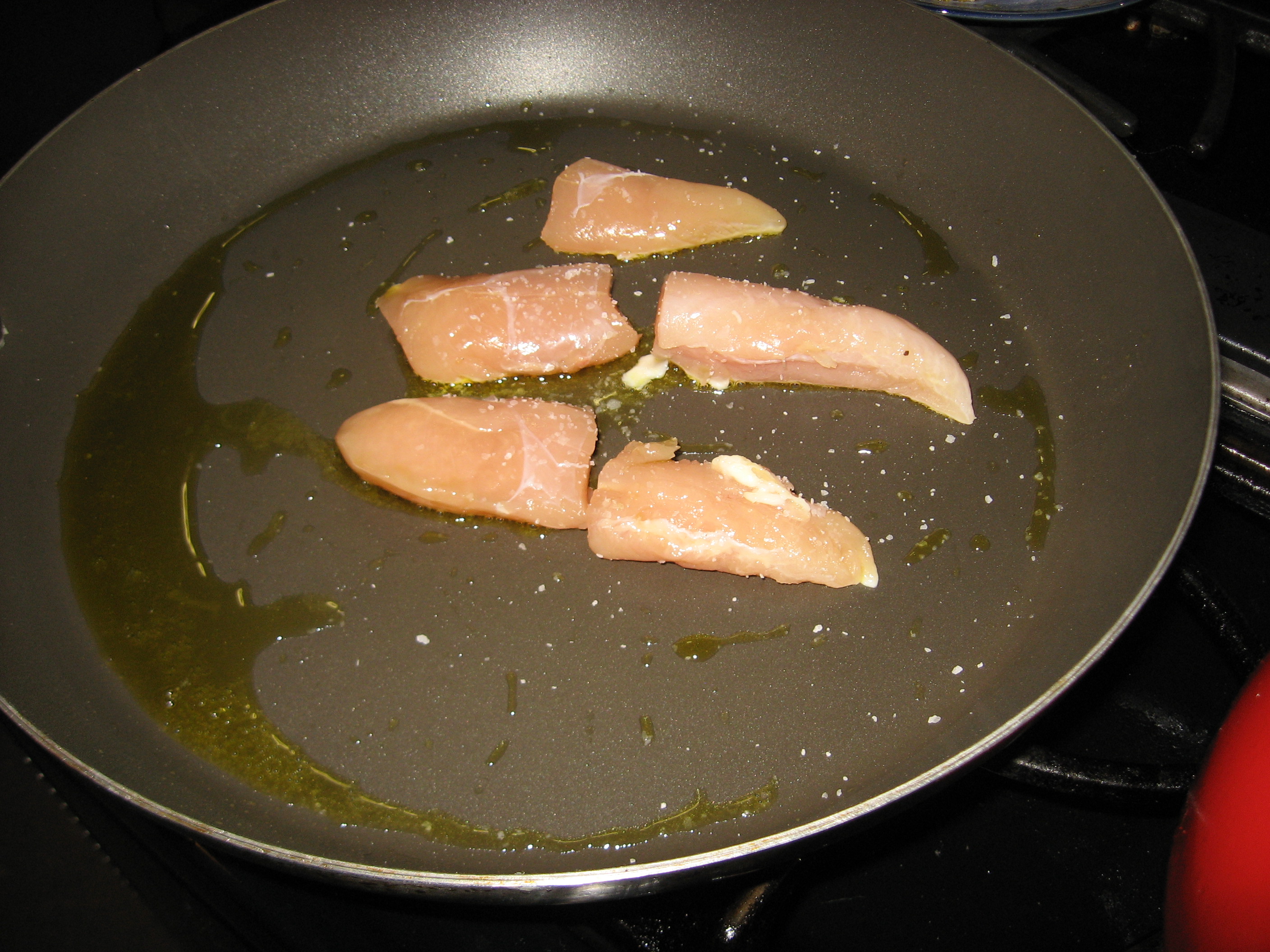 While the water comes to a boil place a large, non-stick pan on the stove over medium high heat. When hot add the olive oil and allow to heat. Season the chicken tenders and sear on both sides to get some color. You may have to do this in batches, as they are done move them to a plate and hold until later. They will not be fully cooked, this is totally ok, they will finish cooking later.