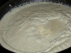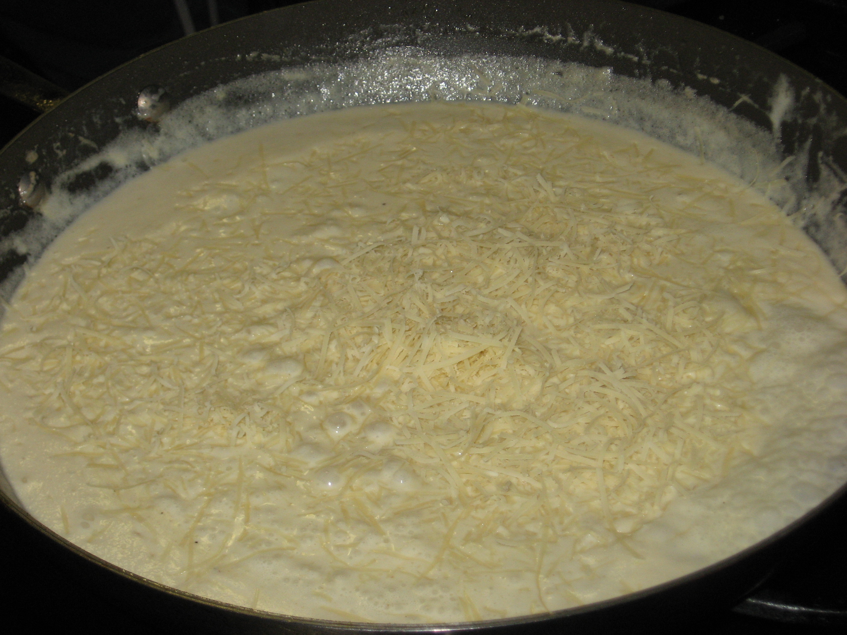 When the cream has reduced by half and thickened add the cheese and stir in with a whisk – be gentle in the non-stick. Bring back to a simmer and make sure all the cheese is melted in. Taste the sauce and adjust seasoning as needed with more salt & pepper.