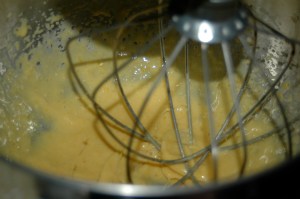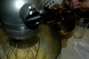 Place all of the ingredients except the oil in the mixer bowl and whip until it starts to thicken and get shiny. To make this go faster I usually have to give the bowl a boost so the whisk can get into the bottom of the bowl and do its job.