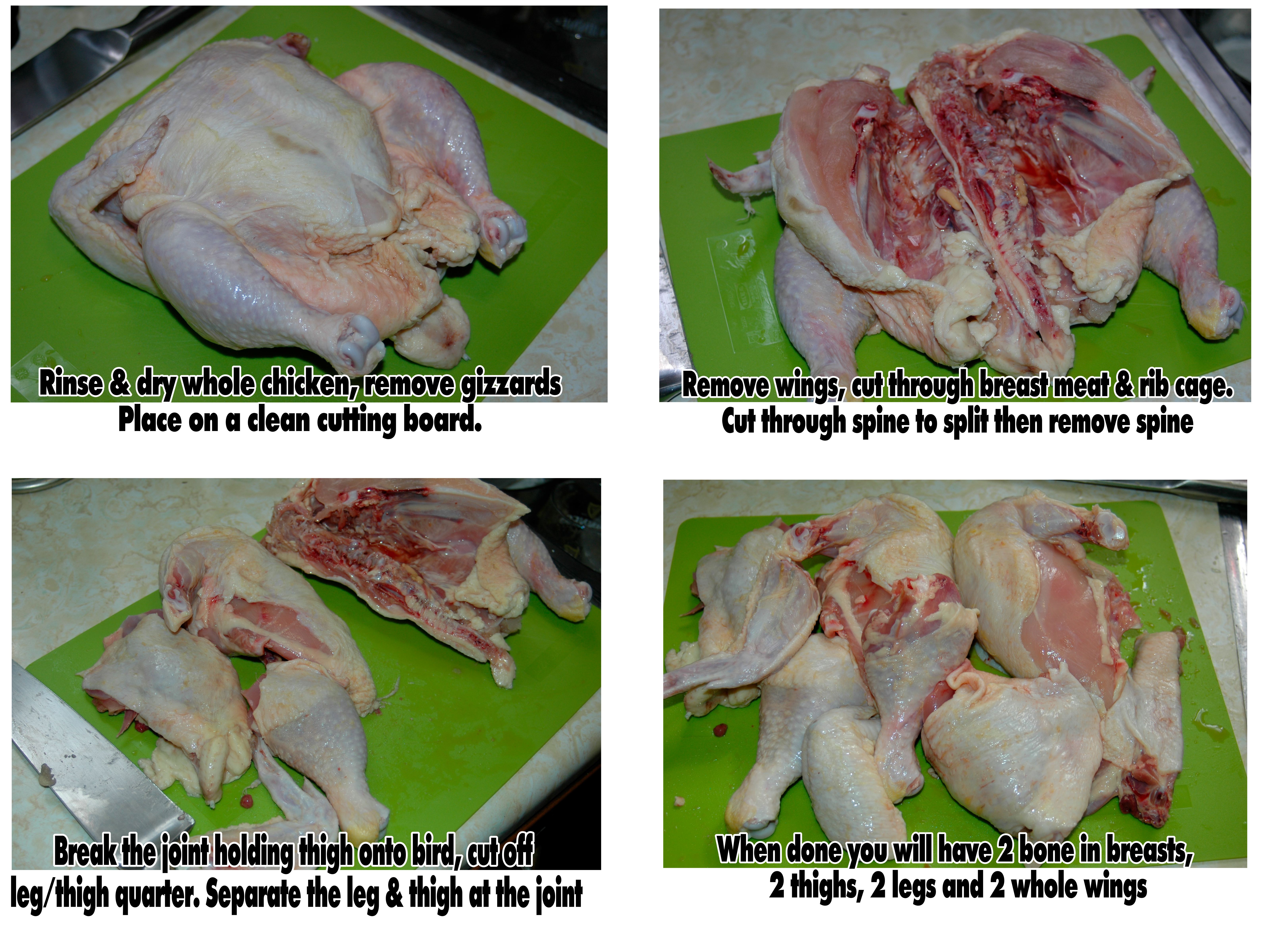 Rinse the whole bird, pat dry & remove the gizzards. Use your hands to break the joint at the wing and breast and use the boning knife to remove both the wings, set aside. Use the tip of the boning knife, up against one side of the breast bone in the center of the breasts, to cut through the breast meat and down to the rib cage. Use the french knife to cut through the rib cage, you will meet some resistance, but chicken bones cut through relatively easily. When you are through the breast open the bird with your hands to get easier access to the spine. Put the tip of your knife to one side of the spine at the neck and bring the knife down to cut the bird in half, cutting the chicken in half. Use the same method and remove the spine from the other half; I save it to throw in the soup & remove when its done.