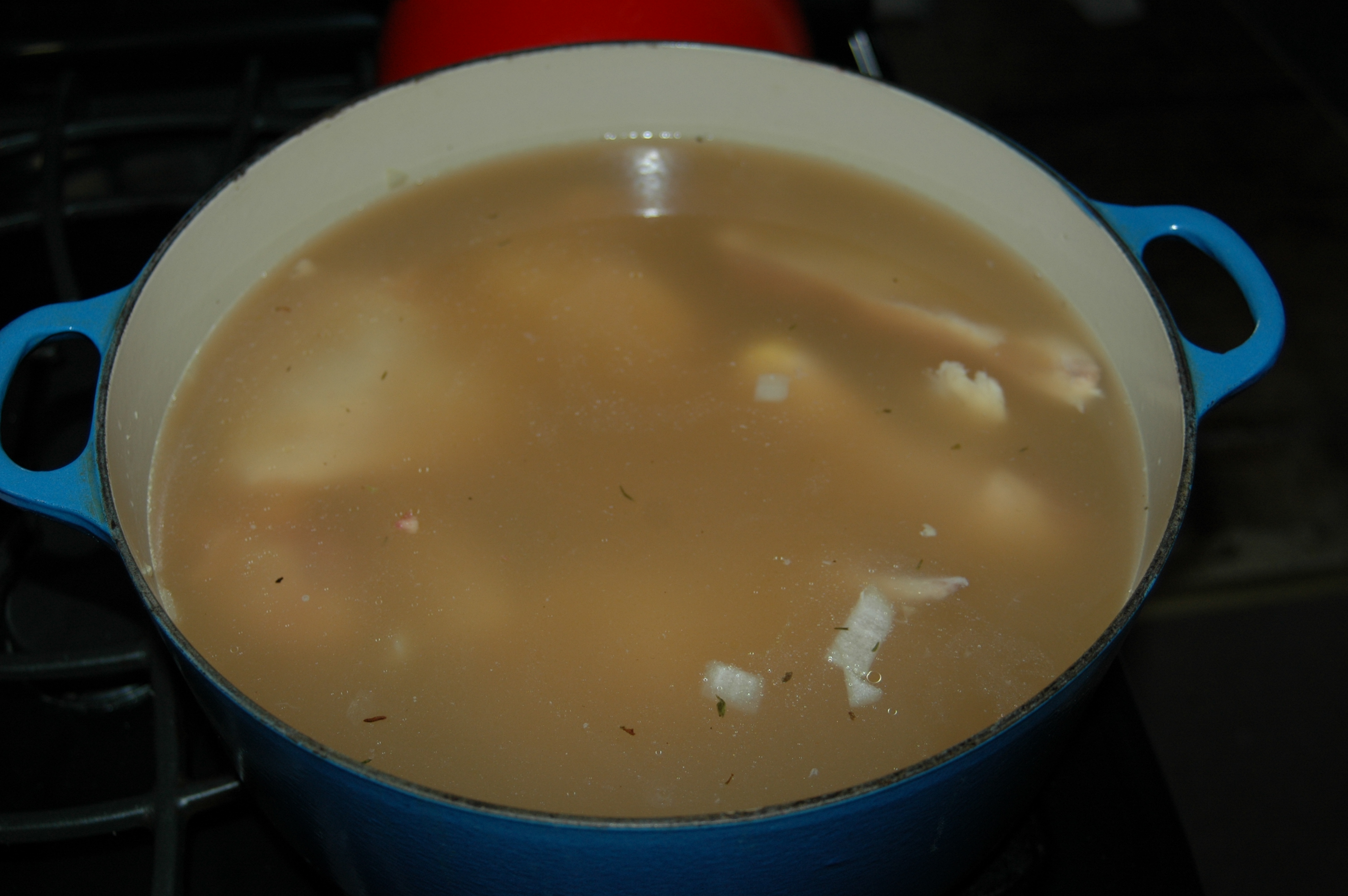 Pour the stock over the chicken and bring to a simmer. You want to make sure the soup doesn’t boil hard, a nice gentle simmer.