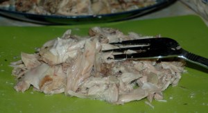 Use tongs and a fork to shred the chicken off the bone and remove the skin. The bone will be fragile. Be thorough and make sure you get out all the little pieces. No leaving death bones in the soup. Thats bad.