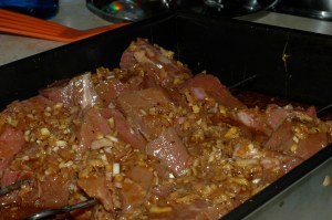 Toss the cubed beef tenderloin (or whatever it is you are skewering) with the marinade. This can be done in a bowl or you can put it all in a gallon bag and smoosh it all around, either method works. Let it sit for at least an hour or two to soak up some flavor, if marinating over night stop and pick up here tomorrow.