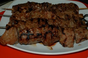 If you feel confident butchering go for it – you can get a superior cut for a decent price, if not get thick steaks – strips, filet, ribeye, good sirloin – and cube them up. If you go with a lesser cut, one that wouldn’t be served as a steak and would more likely be served sliced, like a flank steak, skirt steak or flatiron, cut into 1/2″ strips and make more skewers. You will need to shorten your cook time and grill over a higher heat to get a nice sear and still have them cooked properly, still amazing, though.