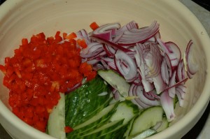 - Julienne half of a red onion and finely dice half of a red pepper. Place all the vegetables in a bowl.