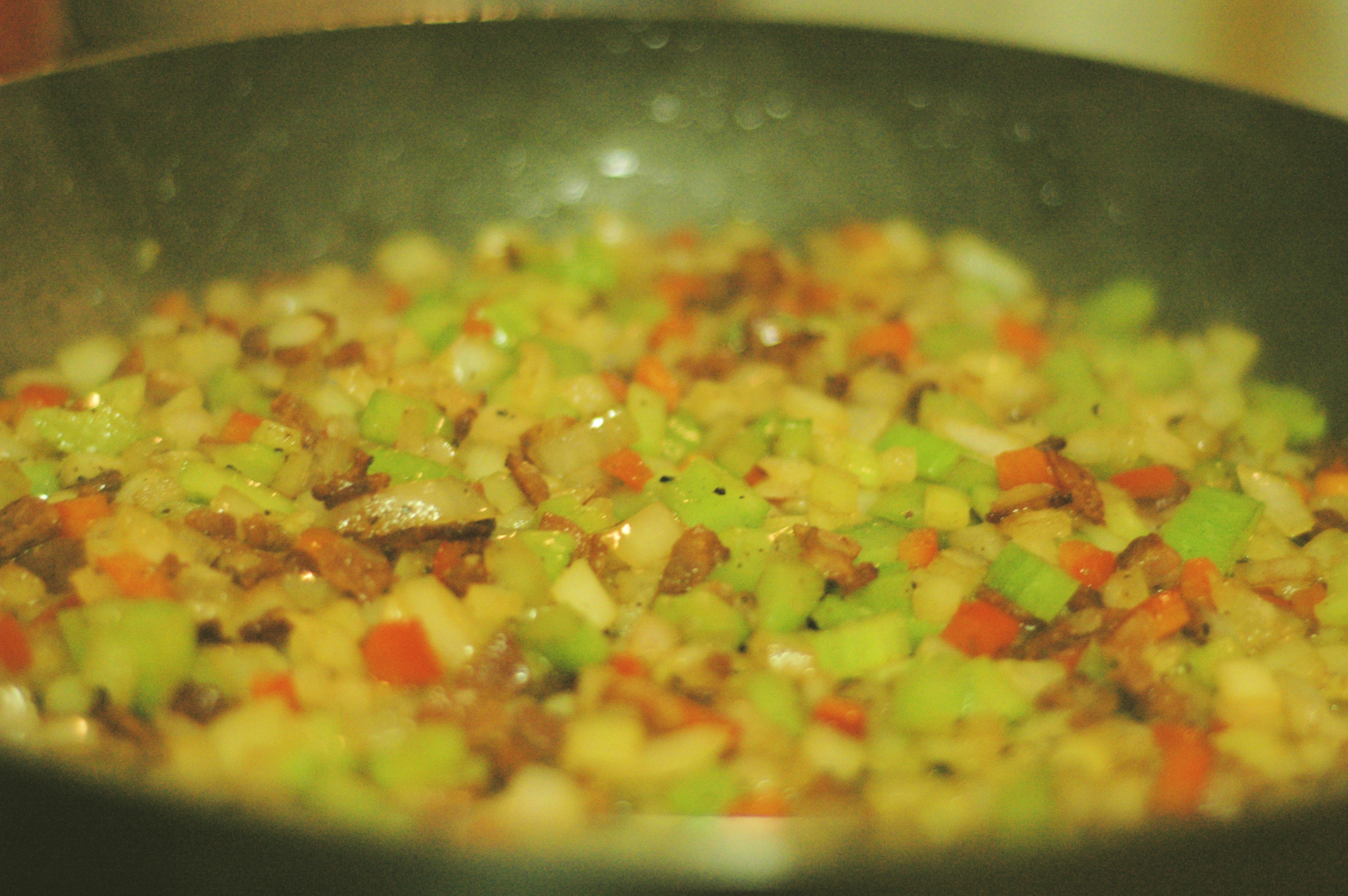 Render the bacon until crisp over medium heat. When the bacon is crispy add the diced vegetables and turn the heat up to medium high. Cook the vegetables while stirring frequently. Cook until the garlic looses the raw smell and the onions are starting to take on some color.