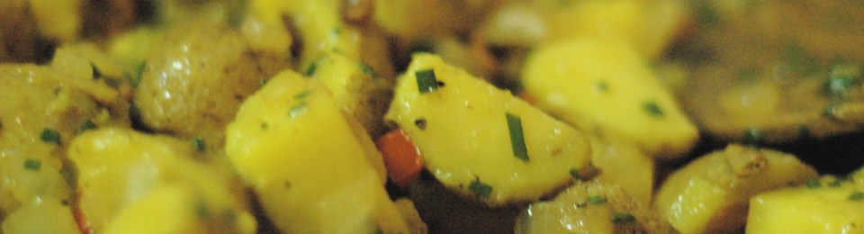 The vinegar is wonderfully tangy and I think any fresh herb, or a blend of them, would be good in place of the fresh chives. A very fresh and bright take on a side dish that is traditionally heavy but is still potato salad. Would also be good minus the bacon, just saute the vegetables in olive oil instead of the bacon grease and add some extra salt.