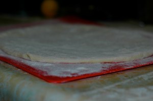 When it has doubled in size dump it out onto a counter and cut into 4 pieces. Round each piece out and set aside. Mix up the flour & rice flour on the counter, roll a dough ball in it and press out into a circle; flip it over and work both sides of the dough to prevent sticking. I use my rolling pin to get it to an even thickness 8-10″ disk then hand stretch it to the finished 14″-ish round. The shell should be about 1/2″ thick and as evenly round as you can make it.