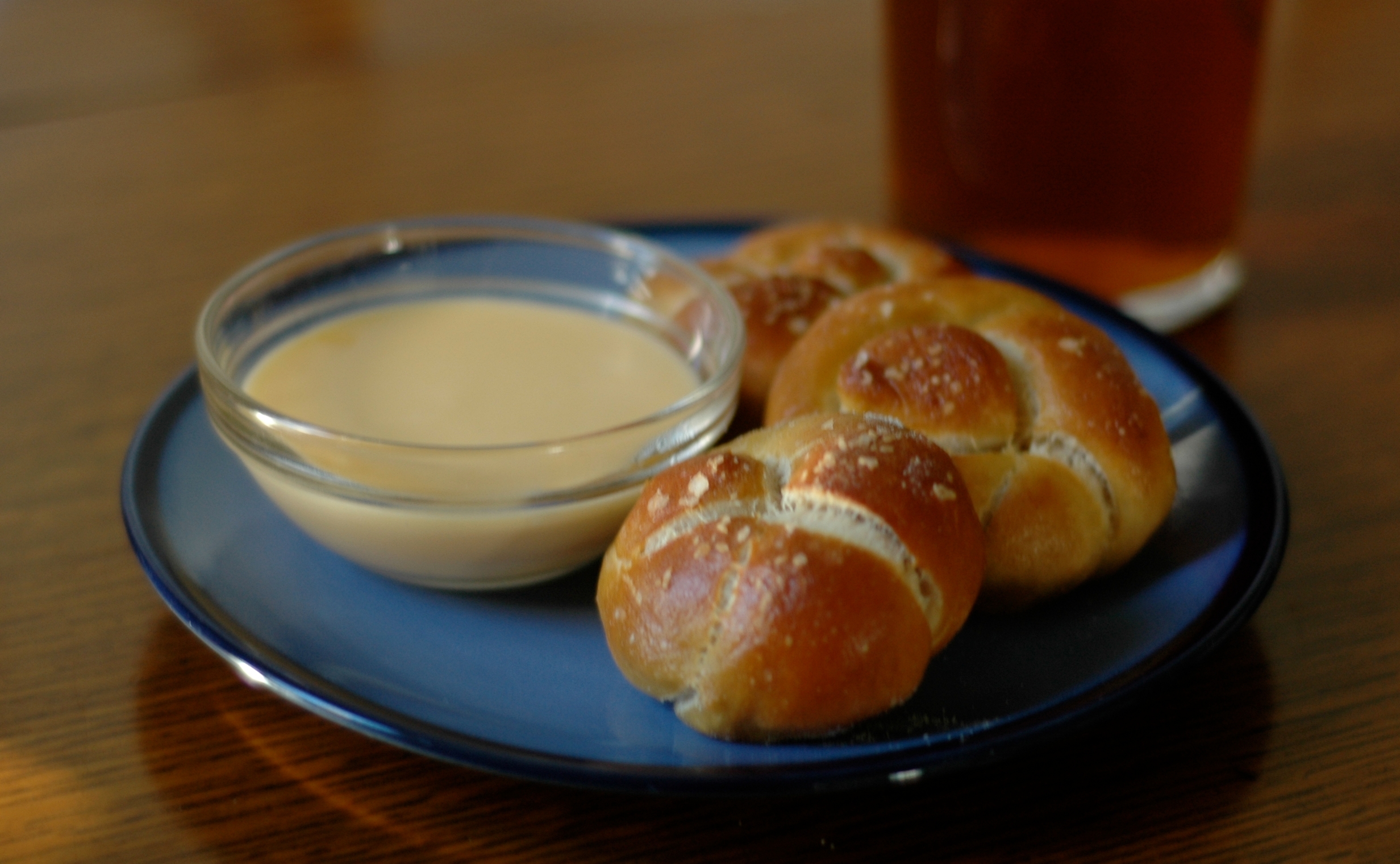 I make the cheese sauce while the pretzels bake – also yummy with good mustard.