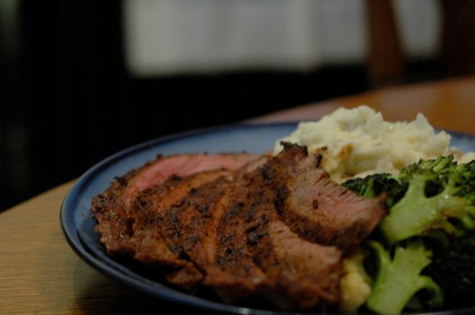 Relatively simple, really. I started this the night before in a silly easy marinade just to get some flavor into the meat, made a dry spice rub to coat the outside with right before grilling, cooked it to medium rare, let it rest and sliced it for a perfect steak. Total prep & cook time for the whole meal was less than an hour & a half…not bad for a big fat dinner! Portion wise your average flank steak is on the plus side of a pound, I usually use 1 whole flank steak for 2 people & this recipe is for one whole flank steak, adjust the recipe accordingly for your crew!