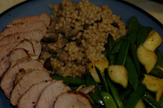 I dig couscous. There are few starches that can be prepared as quickly. Traditional couscous, the coarse yellow stuff that is most often thought of as couscous, is made of semolina that is formed into little balls and is traditionally steamed to be served with stews. What you find on shelves in The States is an instant kind that can be cooked in about 5 minutes with some hot stock & butter. Couscous is a very neutral thing and can be dressed up with sauces, vinaigrettes, vegetables, meat…pretty much whatever blows your hair back, and is good hot or cold. I love the versatility and the quickness.