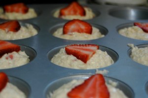 Preheat the oven to 400, your pans prepped, the strawberries chopped up and mixed with 2 Tbsp of sugar.
