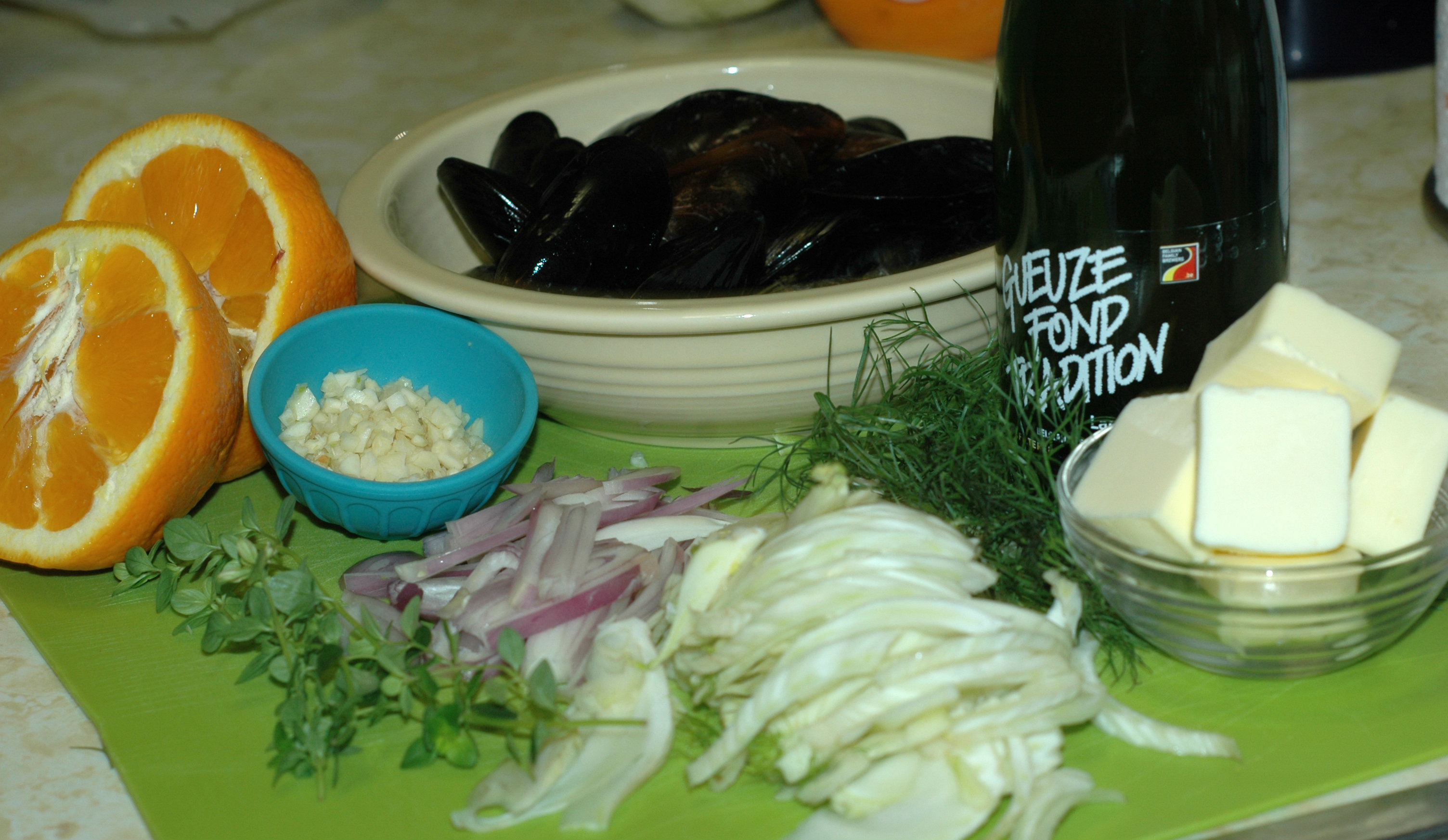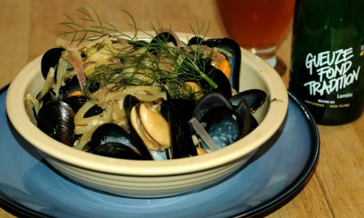 I have used just about every flavor of beer imaginable when making mussels – working as the chef for Belgian themed restaurants with amazing beer selections gave me free reign to play and I did. My personal favorites to use are Belgians – blondes (Leffe, Augustijn), triples (Bornem XXX, Ename XXX), doubles (Petrus Dubble Bruin or Oud Bruin, Bornem or Grimbergen XX), ambers (DeKoninck) and witbiers (Wittekerke). They have a depth of flavor that works beyond well in the sauces. That said I have used a ton of US beers, too, but all of the same basic flavor profiles as the Belgians I listed up there. I know I say this a lot but for mussels I stay away from hops and bitter. Mussels are far too delicate and grab a lot of flavor quickly. No reason to ruin a perfectly sweet mussel with bitter reduced hops. This recipe calls for a Gueze, an unflavored Belgian lambic, that is sour and citrusy when reduced, perfect for mussels.