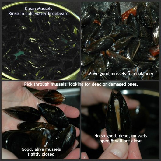 Mussels are a bivalve mollusk, most often farm raised in salt water, but they can live in fresh water, too. Most of the mussels available in North America come from Prince Edward Island Canada, apparently they have prime mussel growing water up there, for that I thank them. Mussels are the kind of seafood that you cook from alive, like lobster, making the most stressful part of mussels for dinner buying and storing before you cook them; they don’t live forever, more like a week or 2 from the day they are harvested if stored properly, which makes picking fresh ones and cooking them soon after you get them home key. My rule ~ I buy them the day before or the day I plan to cook them, no reason not to and it guarantees they are fresh.