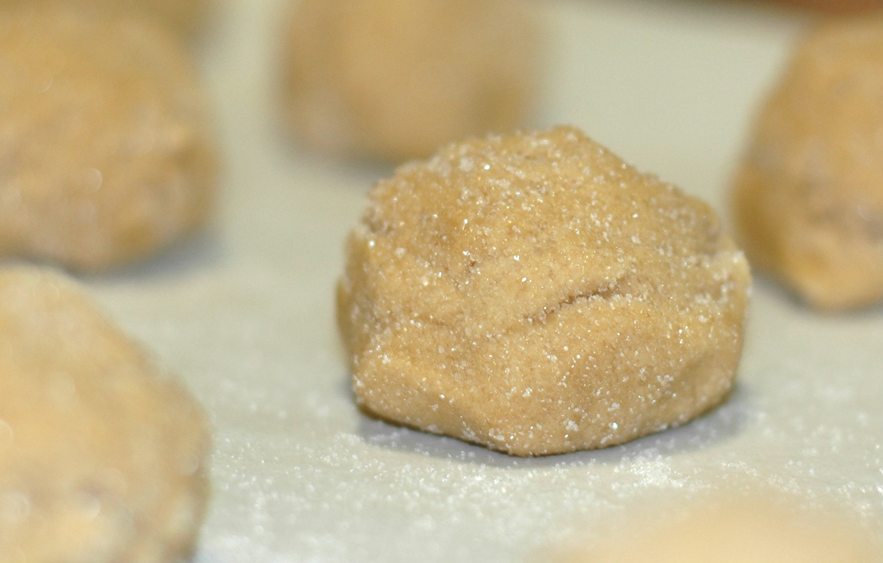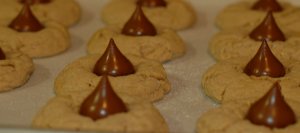 Scoop them into the sugar and coat completely. Line up on the baking sheets and get into the oven. They will bake for 9 minutes – I use this time to unwrap Hershey Kisses