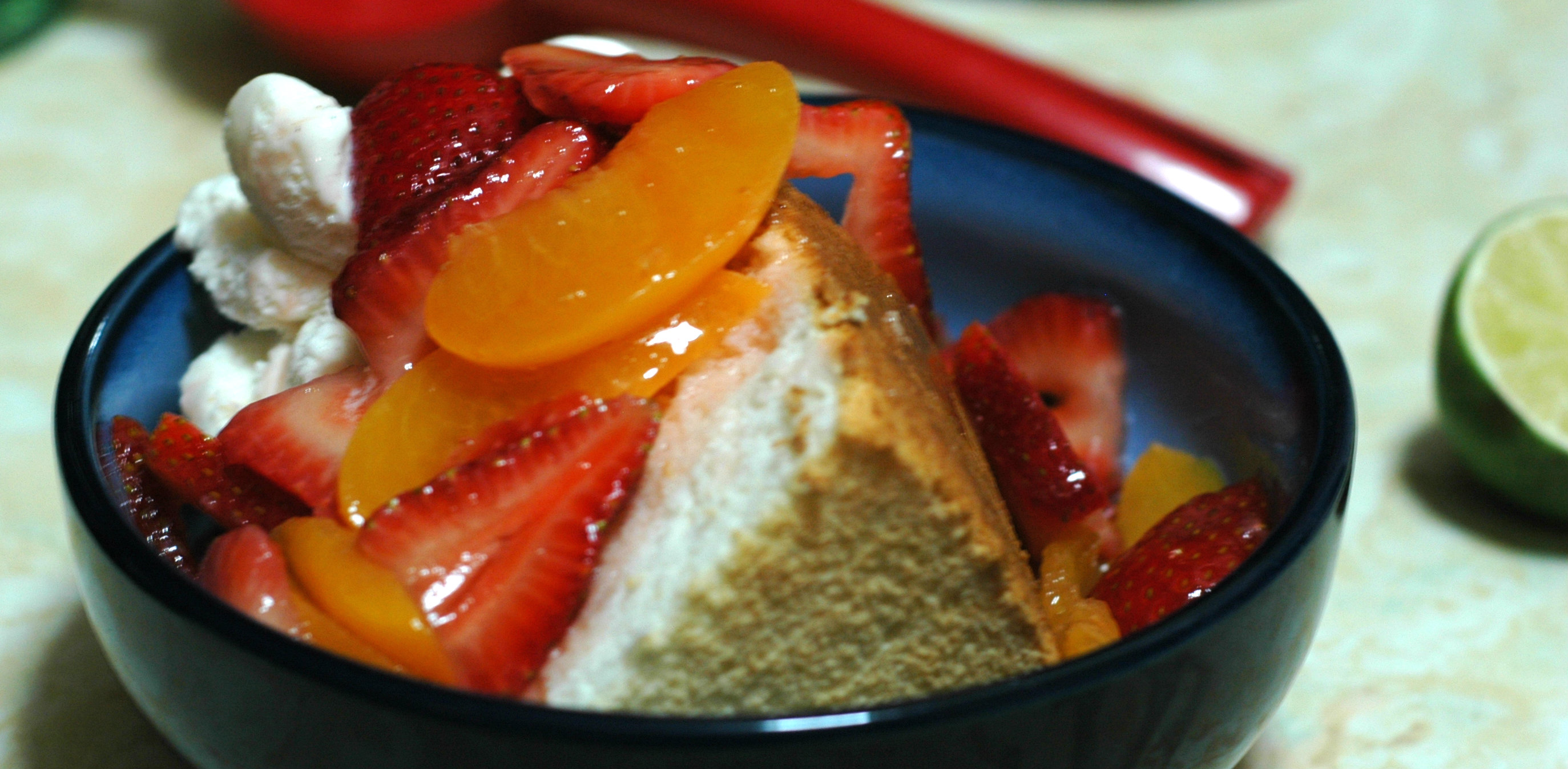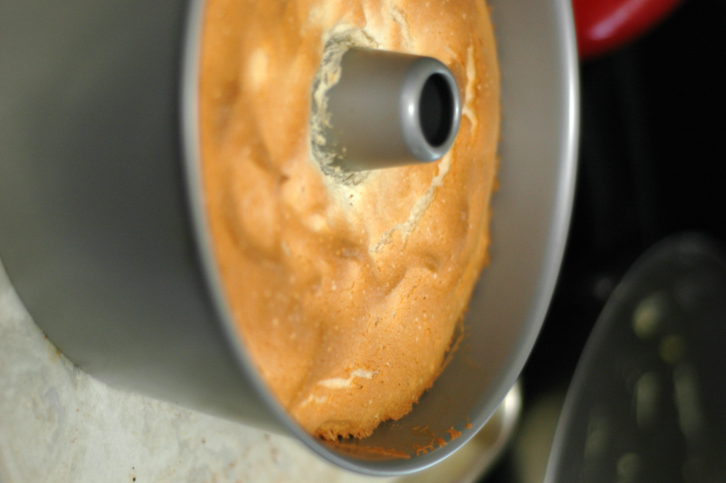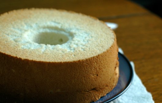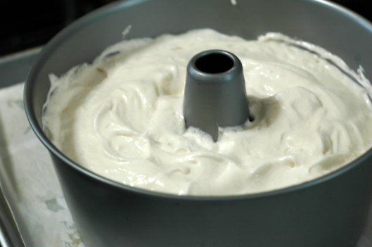 Angel food cake is a light, sweet, airy sponge cake, usually baked in an un-greased tube pan. By itself, even with a glaze, it’s rather unimpressive, though quite tasty and all sorts of useful as a summer dessert component; it soaks up fruit juices, whipped or iced creams, syrups or sauces like a sponge (hence the term sponge cake) while maintaining its structure. Angel food cake, unlike most other cakes, has no fat added to it and is depends on stiffly whipped egg whites for its height & texture with a minimal amount of dry ingredients added to it for structure & stability.