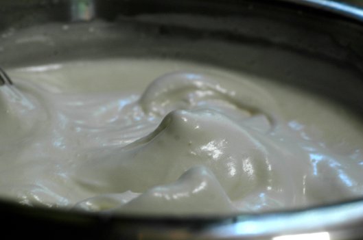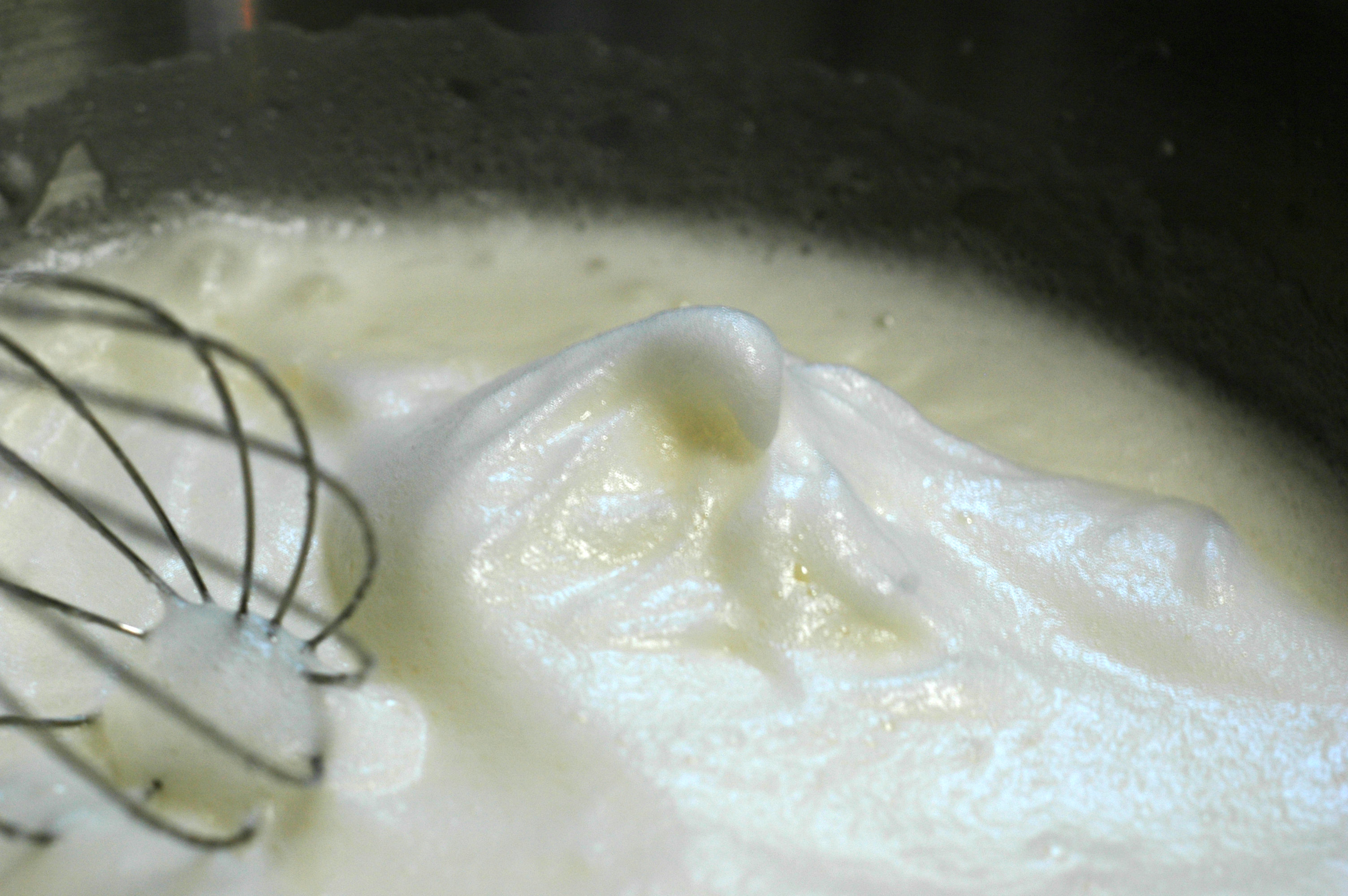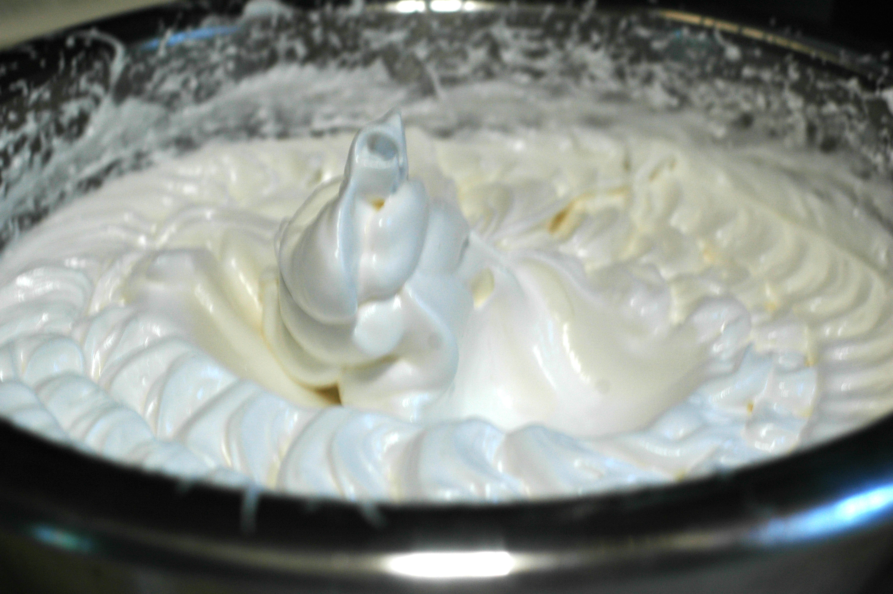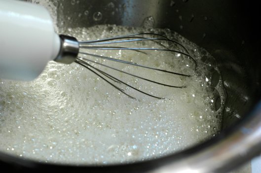 When the whites will hold a soft shape and look like the picture above slowly add the 3/4 cup of sugar in a steady stream while the mixer runs on high, making a basic meringue. Whip to a ‘soft peak’, meaning it will hold its shape when pulled into a peak. At a soft peak the meringue will close to triple in volume, start to look creamy white, be shiny and start to feel stiff.