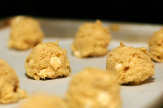 Now one would think that this is just like an ordinary CC cookie, sub white chocolate & macadamias for semi-sweet & almonds (or whatever nut or lack of nut you prefer), and one would be wrong; the cookie itself is a touch different, not just the yumminess inside. WCMN tend to not be as chewy as a regular CC, more crisp and a little lighter in texture. I still like these a touch underbaked, but the edges crisp up more and the cookie itself shouldn’t spread as much so it tends to be thicker overall. Ideally this cookie has a balance between a rich buttery flavor with a lighter, crisper texture than your average CC cookie.