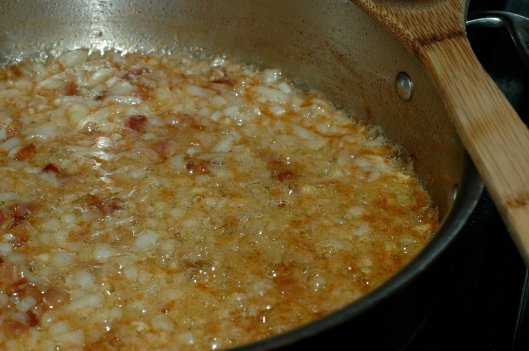 While the pasta is cooking dice the bacon, onion and garlic. Melt the butter in a pot or pan and add the bacon. Render until it is mostly crisped, but not crispy. Use a slotted spoon to remove as much as you can, all of it is not necessary but get out as much as possible, and set on a paper towel lined plate to add to the topping later. Add the onions and garlic to the pan and cook over medium heat until softened and sweet smelling, about 4 minutes. You can see there is still some bacon left in there.