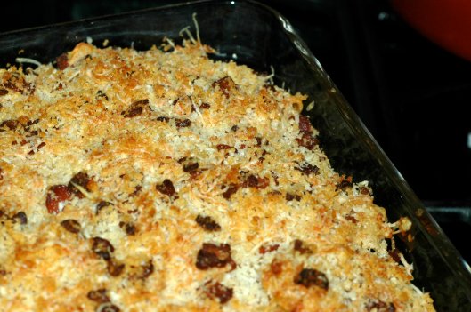 Mix the pasta and the sauce together. It should be a tad saucy, that’s on purpose. Put the sauced pasta in your pan, I use a glass baking dish that is the same volume as a 9×13, it’s smaller but deeper; make sure it’s big enough to hold all the awesome.