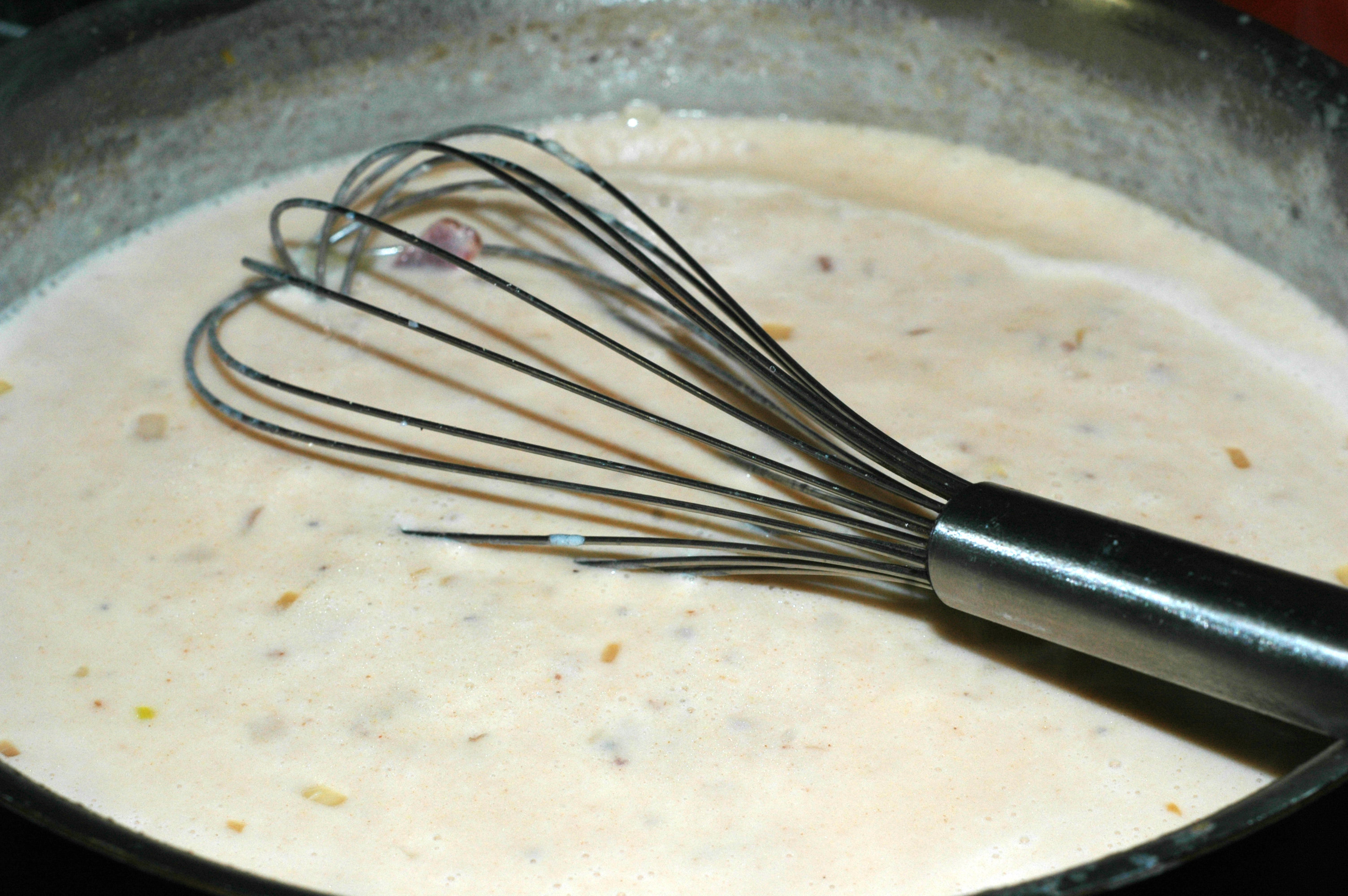 When the onions & garlic are cooked sprinkle the flour over the whole mixture and mix until it is all incorporated and the mixture has no flour lumps. Slowly add the milk while you stir with a whisk, working the roux out and making sure you have no lumps. Leave the heat at medium and stir while it starts to thicken up. Season with salt & pepper, nutmeg, a touch of hot sauce and the tomato paste. Bring it to a gentle dimmer & keep stirring until it thickens to nappe and when you taste it you don’t catch any starchy flouriness. Takes about 8 minutes.